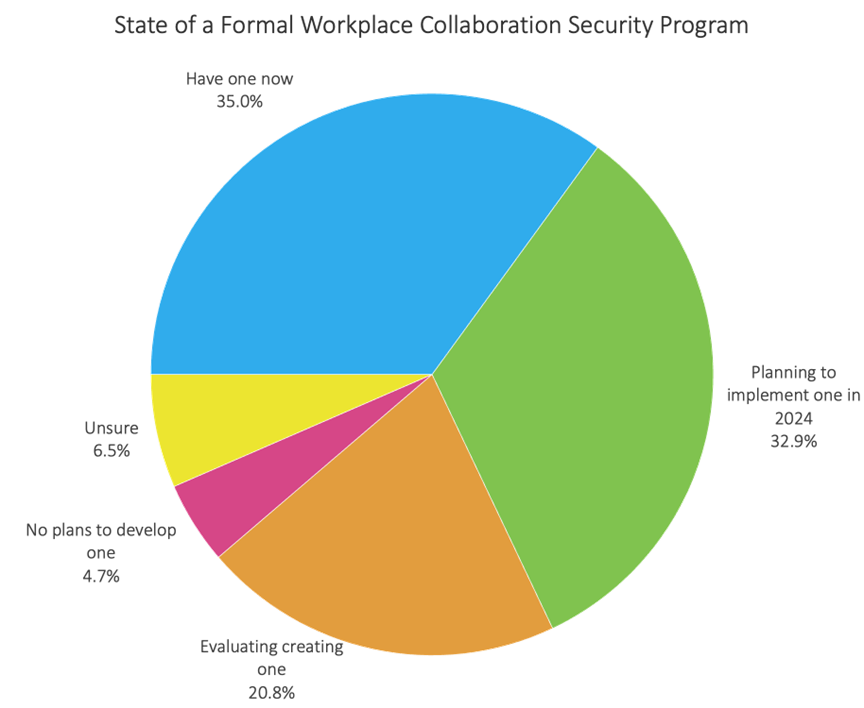 Unfortunately, enterprise efforts to combat rising attacks are not yet sufficient, in most cases, to address them. Among our participating companies, just 35.0% say they currently have a formal workplace collaboration security program covering all of their communications and collaboration applications. More encouraging, about 33% say they will have one by the end of this year and another 20.8% say they are evaluating creating one. However, these numbers are virtually unchanged from our early 2023 study. The reality is that creating a comprehensive security program is hard. It requires resources that are often constrained and that are more focused on day-to-day operations and reaction to incidents rather than a proactive effort to reduce them in the first place. Those that lack a proactive approach often find that they are unable to take advantage of emerging collaboration capabilities, and therefore may further harm security posture as employees seek out applications on their own, outside of IT control, to improve their ability to work with colleagues and customers.