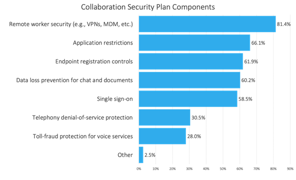 Gone are the days when companies primarily had to focus on email and phone systems (though those are still important). Today, the modern organization collaborates and communicates far more via messaging and video applications, as well as with customers via consumer social and messaging apps. Security approaches often fail to keep up with these changing dynamics. Indeed when we asked those who had, or were developing, a workplace collaboration security program to share the components of it, we found that protection against threats to remote workers dominated the list. Phone-specific threat prevention was near the bottom, and few had included outbound calling protection within their plan.