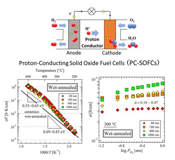 (Top) Schematic diagram of a PC-SOFC; (Bottom left) Arrhenius plot and activation energy of BCPY thin film on the anode side; and (Bottom right) Conductivity of BCPY thin films as a function of oxygen partial pressure.view more